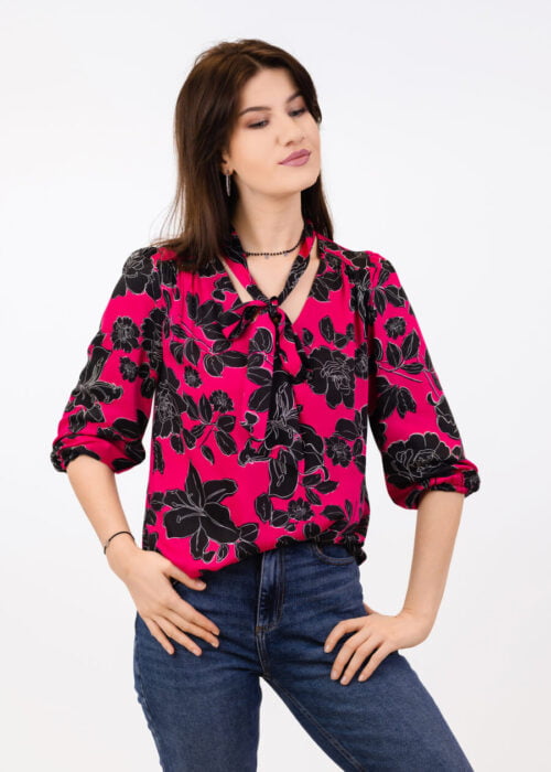 Popielata bluzka o bardzo kobiecym fasonie. Popiel połączona z różem to materiał z jakiego została uszyta bluzka. Kolorowy kwiatowy print. Dekolt w klasyczną łódkę, w który została wszyta gumka, dzięki czemu pięknie się układa. Na wykończeniu bluzki znajdują się ozdobne wiązane sznurki zakończone chwostami. Na uwagę zasługują piękne szerokie mankiety.